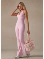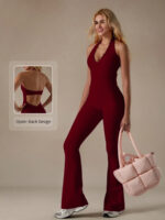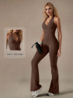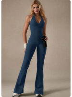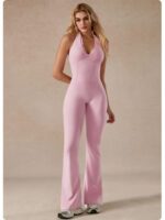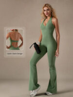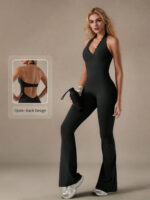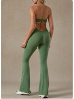 Lace V-neck bodysuit yoga wear for women, fashionable backless, hip-lifting, tummy-flattening halter neck jumpsuit flared pants