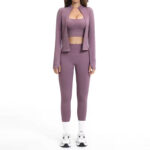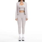 The zip-up long sleeve jacket is your ultimate layering piece – wear it open over the ribbed top for a chic look, or zip it up for extra warmth during warm-ups. The ribbed sports top offers medium support with a stylish texture that stands out, while the high-waist seamless leggings provide a flattering silhouette with full squat-proof coverage.